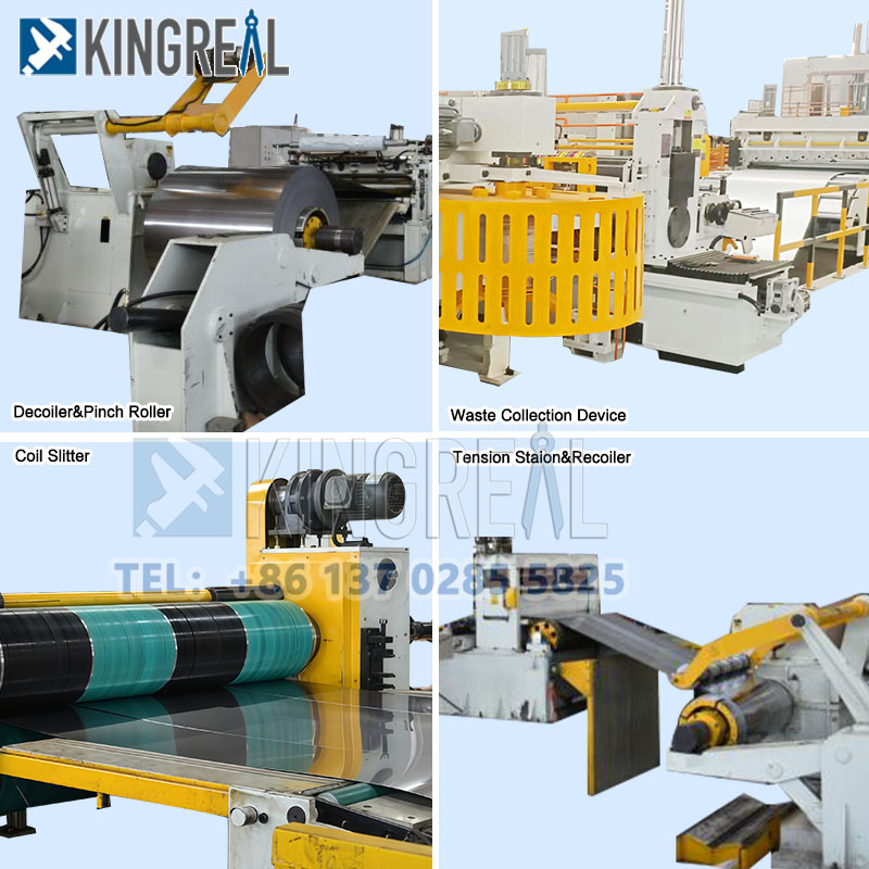 Kingreal Slitter Slitless Slitling Slitting Line adalah utama terdiri daripada decoiler, mesin slite keluli dan rewinder. Pada masa yang sama, komponen yang berbeza direka mengikut ciri -ciri keluli tahan karat.
